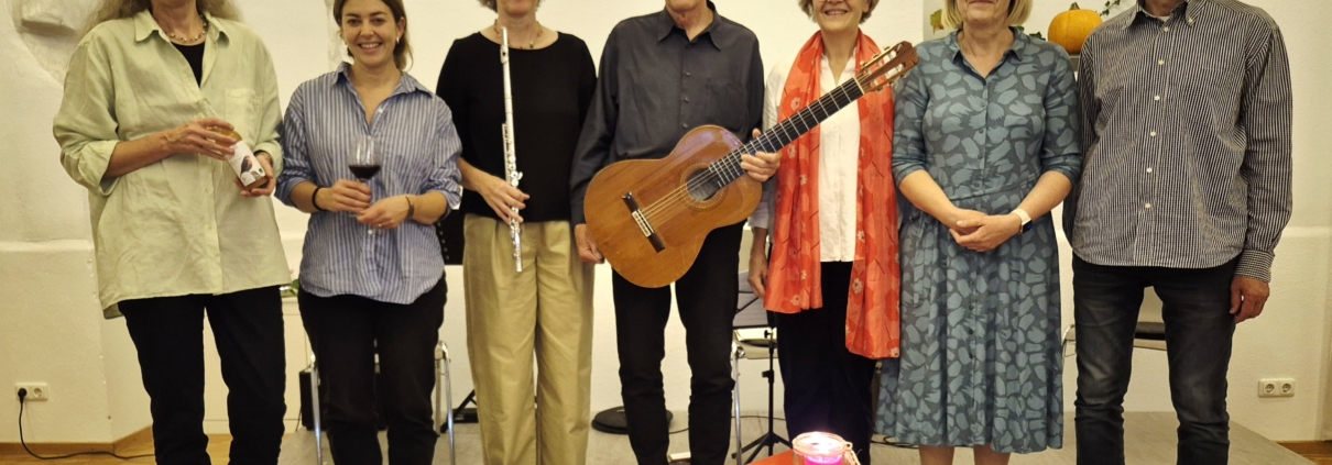 Ein veritabler Genuss-Abend, komponiert aus Musik, Wein und Säften im herbstlich geschmückten Saal der Alten Knabenschule, erfreute die zahlreichen Besucherinnen und Besucher. Die Akteure des Abends (v.l.): Imke Bieber (AK Kultur), Öko-Winzerin Franziska Schömig, Eva Ewert (Flöte), Bernhard von der Goltz (Gitarre), Christine Steinkrauß (Viola) und die Vorsitzenden der IGU für Rimpar, Margarete May-Page und Wolfram Bieber.